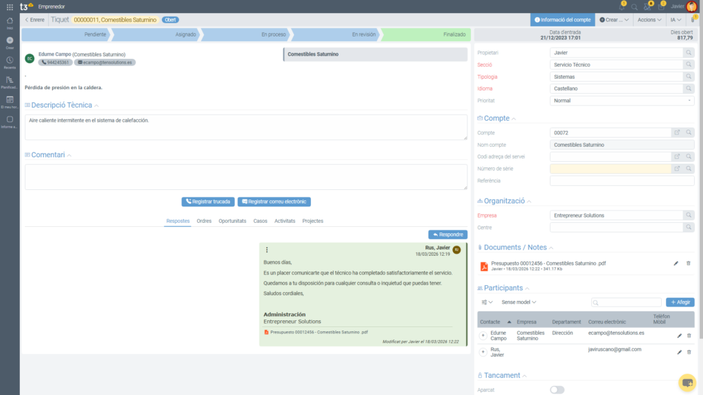Amb T3, els documents es poden guardar directament dins del sistema i associar-los a clients, projectes o incidències. Això facilita que tota la informació relacionada amb una activitat estigui disponible en un mateix lloc.
